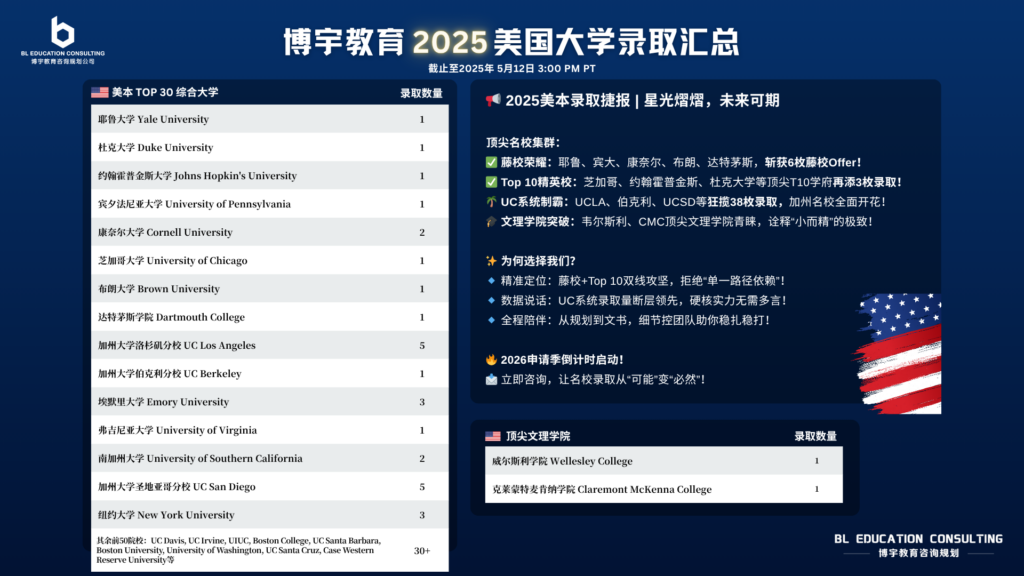 美国大学规划申请 本服务主要针对8年级到12年级的学生。美国大学申请要求提供8-12年级各科的成绩,另外,大学不同的学科都有其具体8-12年级科目预修要求以及标准化考试成绩。因此,学生应该在8年级开始就做好详细的学习规划,为12年级时的美国大学申请打下良好的基础。 服务内容 选课服务 课程选择建议学习能力和表现评估课程方案选择课程表的制定兴趣和性格分析 时间规划和选课指导 义工性质|机构&小时数实习公司和经验积累竞赛报名和选择(optional)校园参观路线和活动指南大学路演活动信息和时间安排假期考试培训指南 课外活动项目指导 校园参观路线和活动指南大学路演活动信息和时间安排假期考试培训指南大学最新动向报告美国就业数据分析大学奖学金数据统计 大学申请准备 申请材料准备网上申请填写申请材料寄送跟踪申请状况录取选择 教育行业最高资质 录取数据展示 | 博宇大学申请规划部分成就 发表Concord Review历史科研文章 3名11年级学生获美国著名科研项目录取并将于暑期完成论文发表 100%美国12年级申请的学生获得省级以上各类奖项 100%美国大学申请学生进入美国前35院校 100%加拿大大学申请学生获得UBC, UT, McGill一所或多所录取 100%学生被第一志愿或一类专业录取 (工程,商科,医科等) 100% 11-12年级美国大学申请规划的学生被全球顶尖夏校录取(Ross, M&T, YYGS, Stanford humanities institute, concord review等)